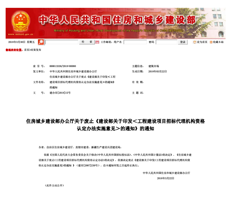 《住房城鄉(xiāng)建設部關于廢止<工程建設項目招標代理機構資格認定辦法>的決定》已經(jīng)2018年2月12日第37次部常務會議審議通過,現(xiàn)予發(fā)布,自發(fā)布之日起施行。