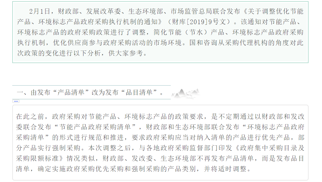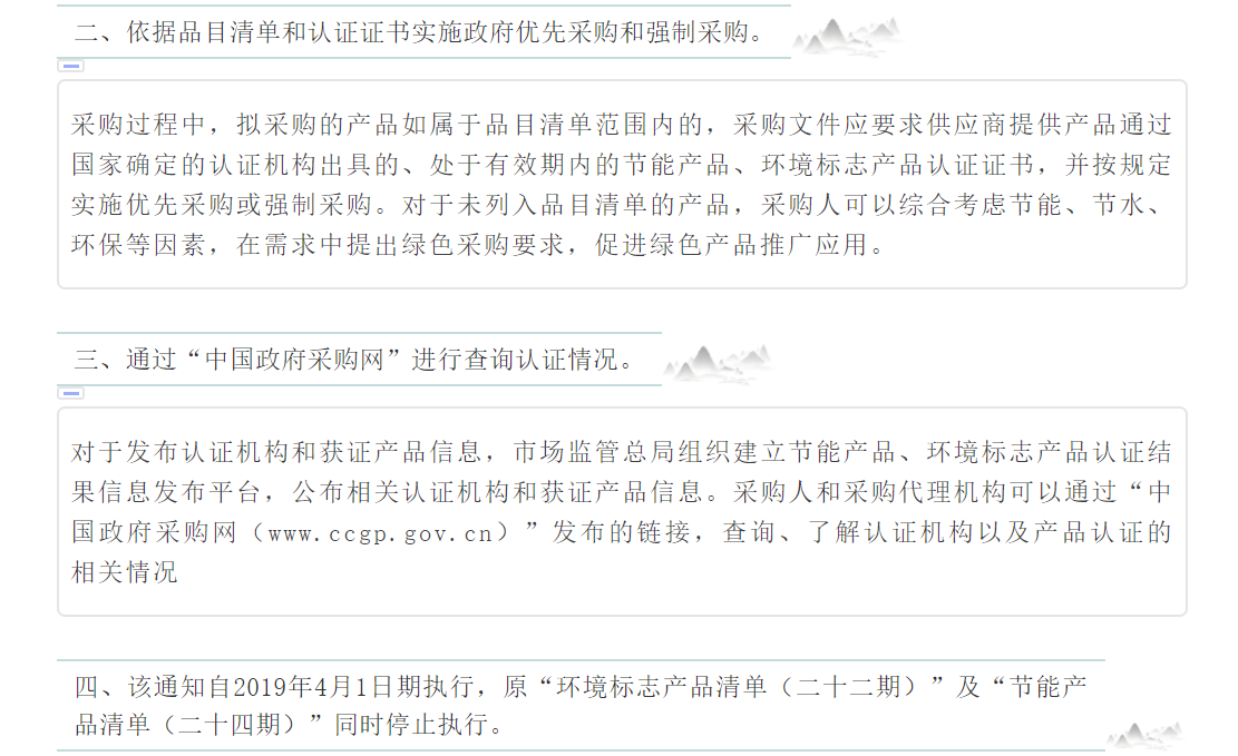 一、 對(duì)政府采購(gòu)節(jié)能產(chǎn)品、環(huán)境標(biāo)志產(chǎn)品實(shí)施品目清單管理。財(cái)政部、發(fā)展改革委、生態(tài)環(huán)境部等部門(mén)根據(jù)產(chǎn)品節(jié)能環(huán)保性能、技術(shù)水平和市場(chǎng)成熟程度等因素,確定實(shí)施政府優(yōu)先采購(gòu)和強(qiáng)制采購(gòu)的產(chǎn)品類(lèi)別及所依據(jù)的相關(guān)標(biāo)準(zhǔn)規(guī)范,以品目清單的形式發(fā)布并適時(shí)調(diào)整。不再發(fā)布“節(jié)能產(chǎn)品政府采購(gòu)清單”和“環(huán)境標(biāo)志產(chǎn)品政府采購(gòu)清單”。